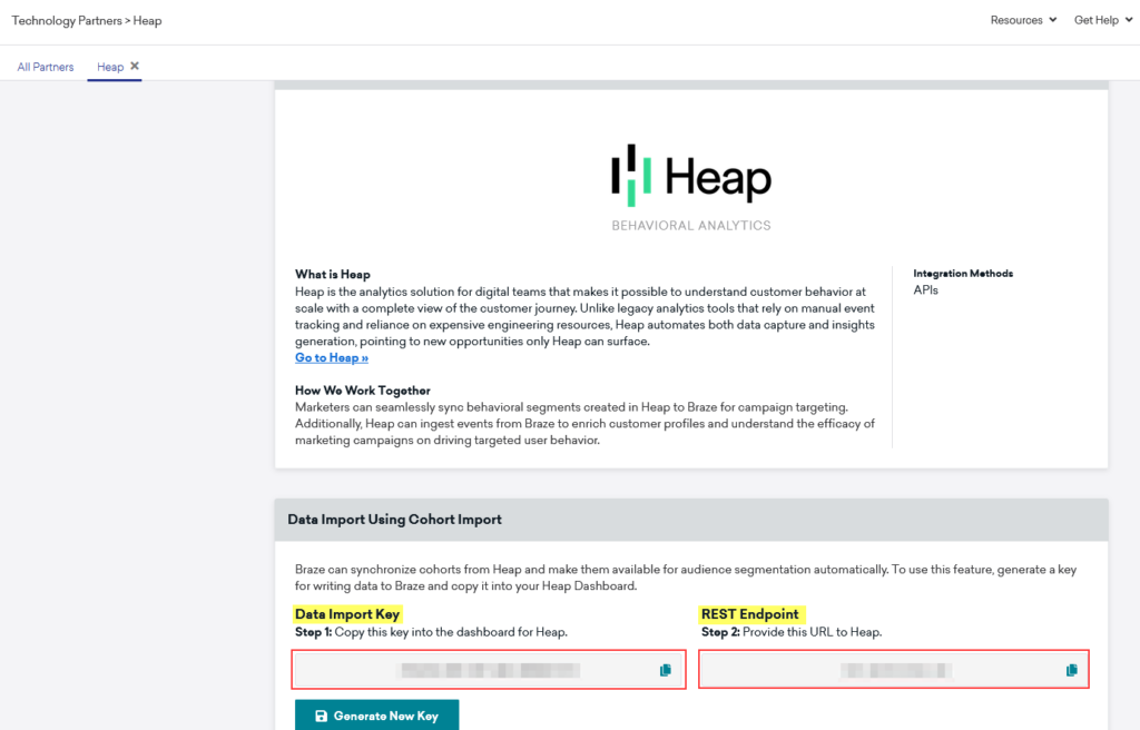 Once Heap is selected, the Cohort Key (secret) and Endpoint will be displayed. If one does not exist, click the Generate New Key button to create one. Note that this will replace any previous key if one already exists.