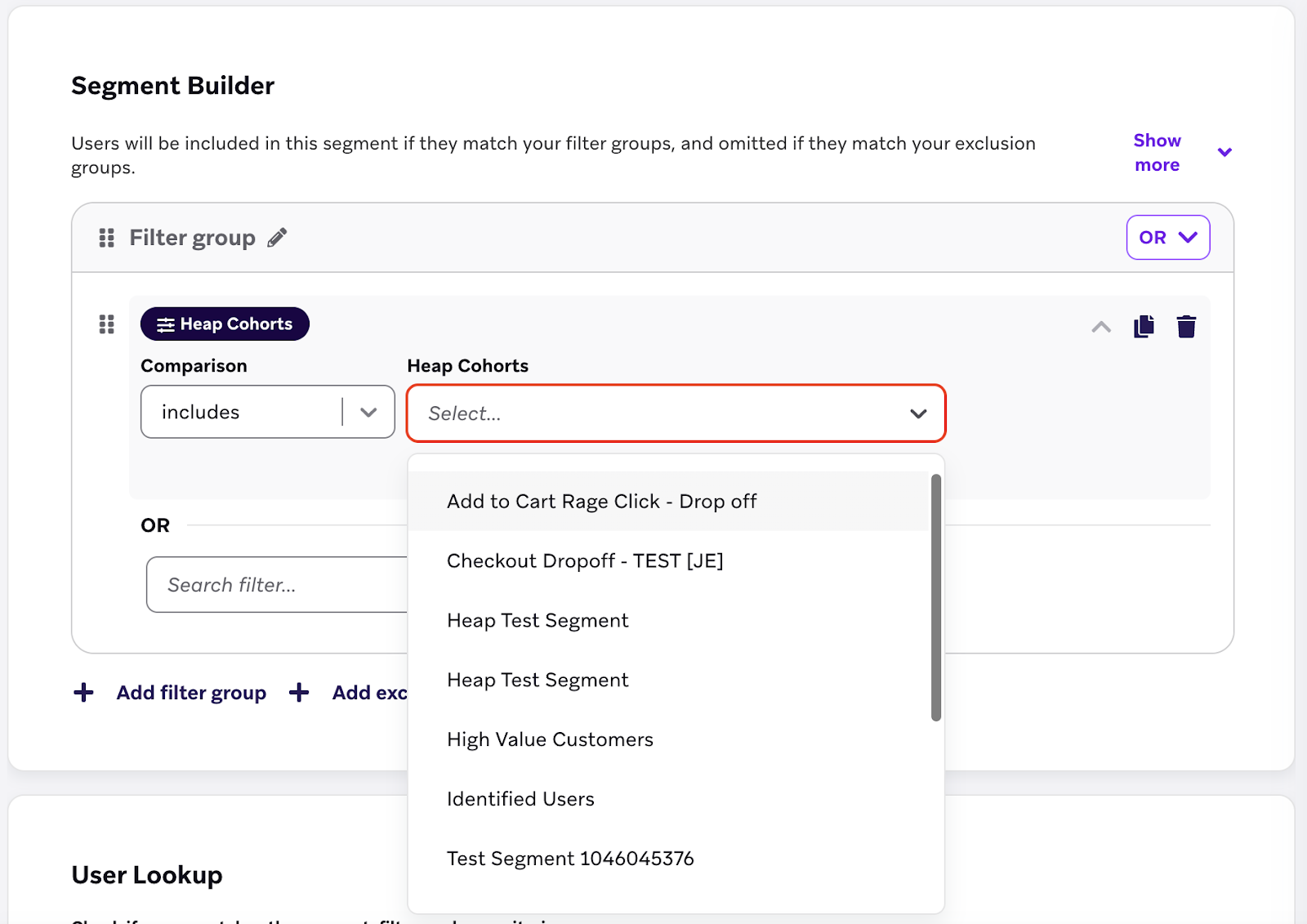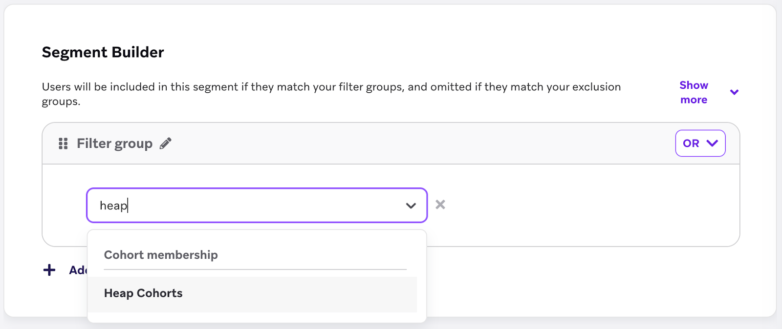 Next, search for a Cohort value. Because the Cohort will be created with the same name as the Heap segment, search for the Heap segment name here. You can also add any additional filter criteria that you’d like to complete the Braze Segment.