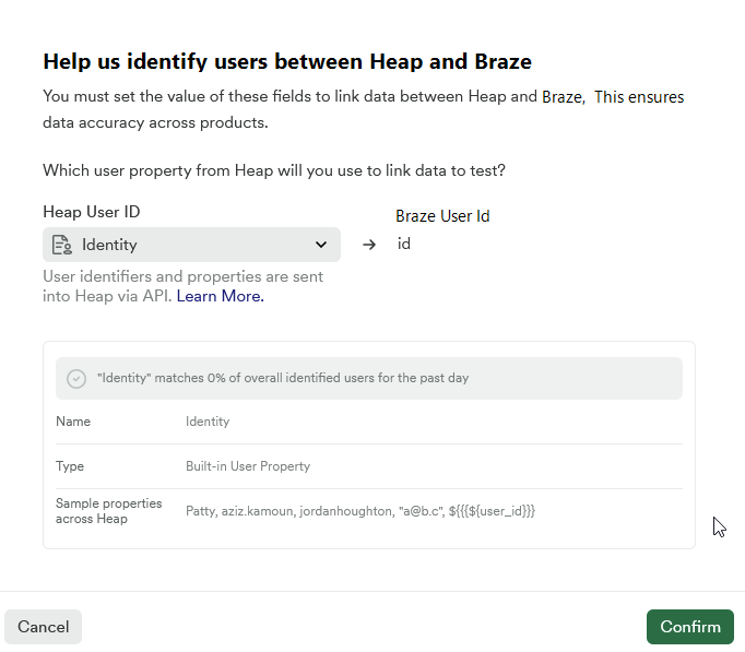 The first time you sync a segment from Heap to Braze, you’ll be asked to select which field from Heap should be sent to Braze. This can be things like identity, email, or various Heap user properties. Click Confirm to save your choices.