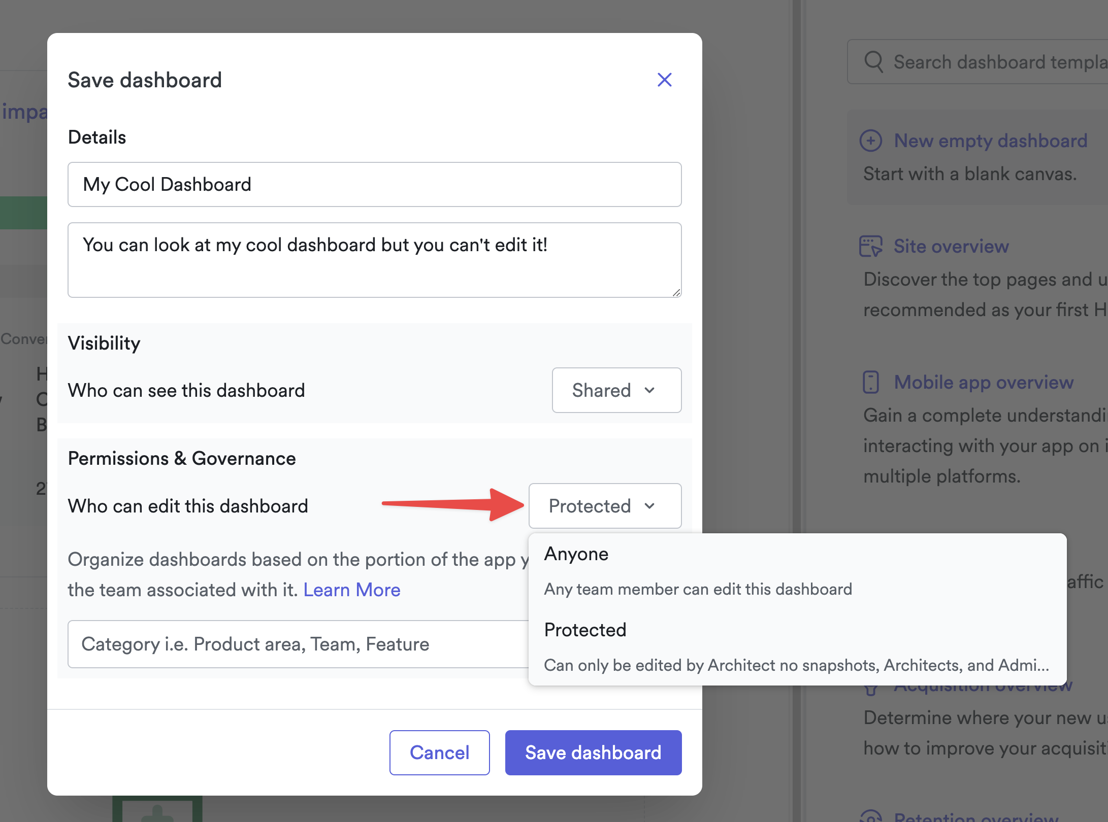 When you create a new dashboard, you’ll choose between letting anyone edit it, or only Architects and Admins.