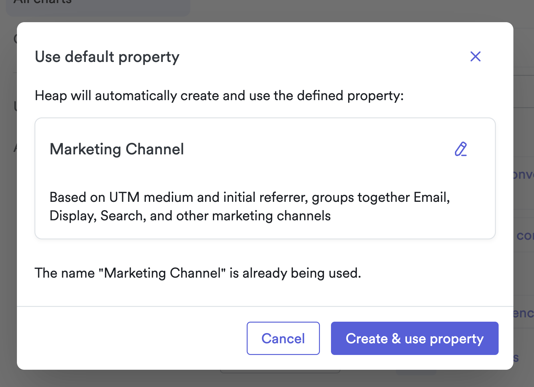 To add the Marketing Channel property, open the chart template Which marketing channels are driving my conversions? Click the Use Heap Default button in the second question of the popup.