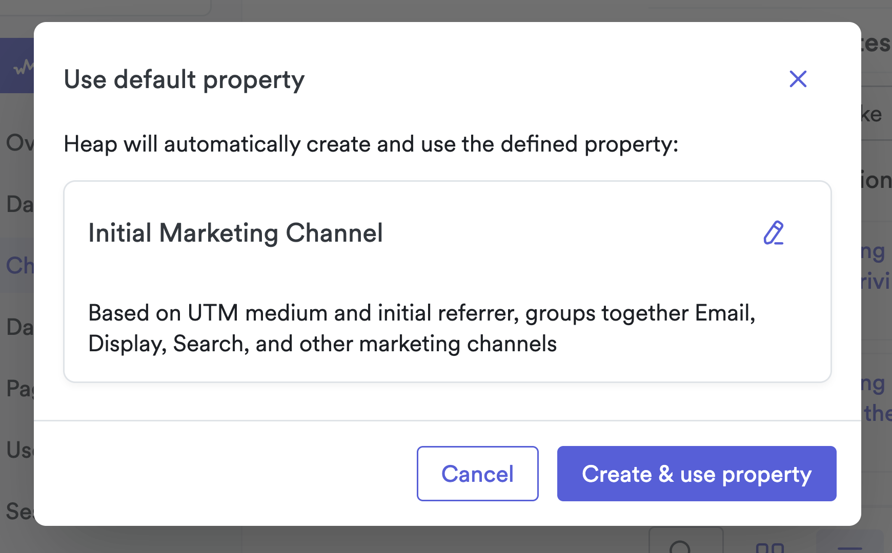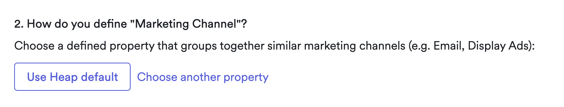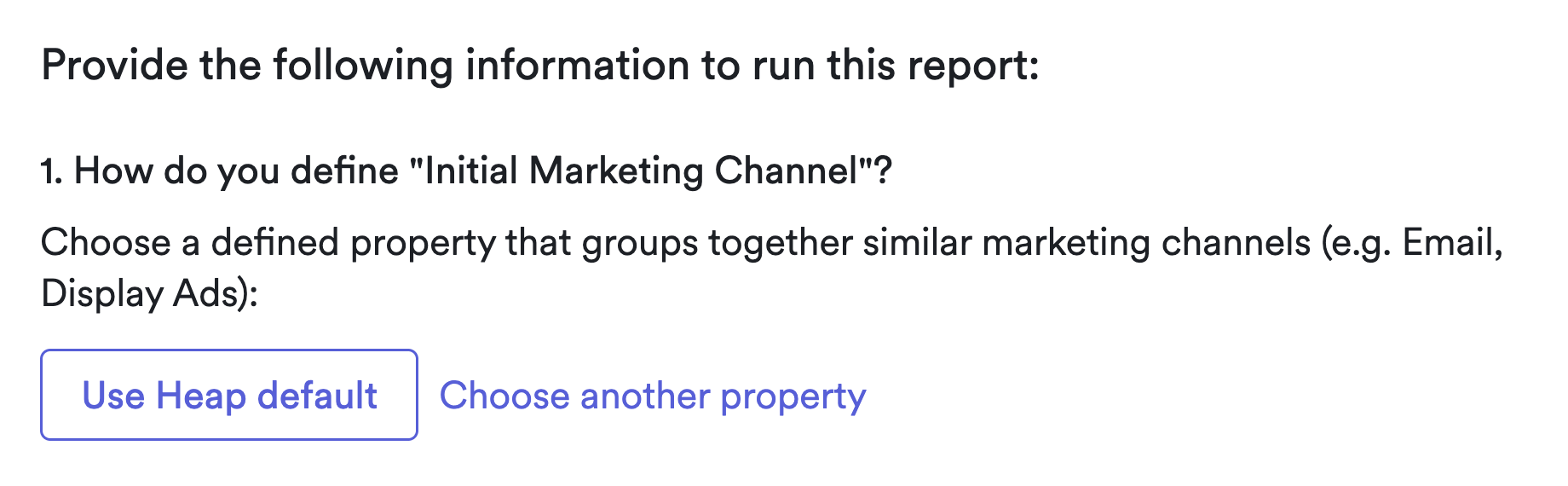 To get the Initial Marketing Channel property, open the chart template Which marketing channels drive the most traffic? Click the Use Heap default button in the first question of the report.
