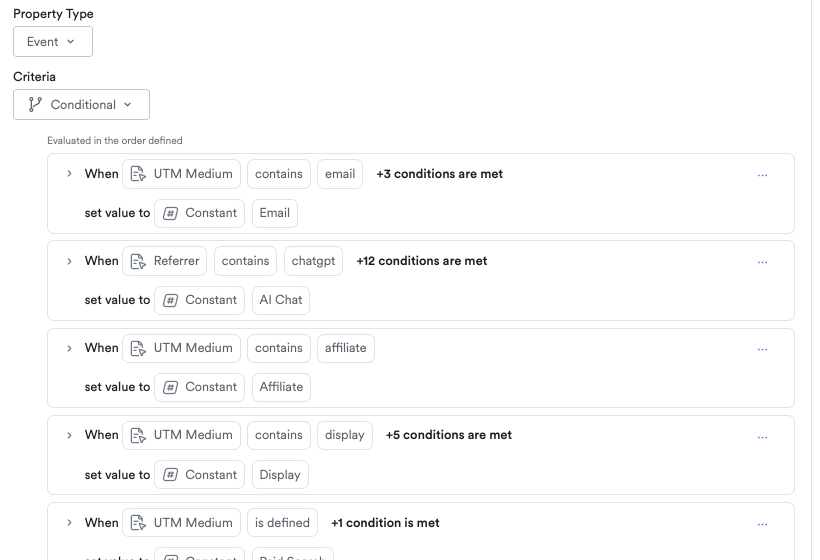 Position the AI Chat channel before the Paid Search condition in your property configuration. This ensures AI-referred traffic is classified correctly before other conditions are evaluated.