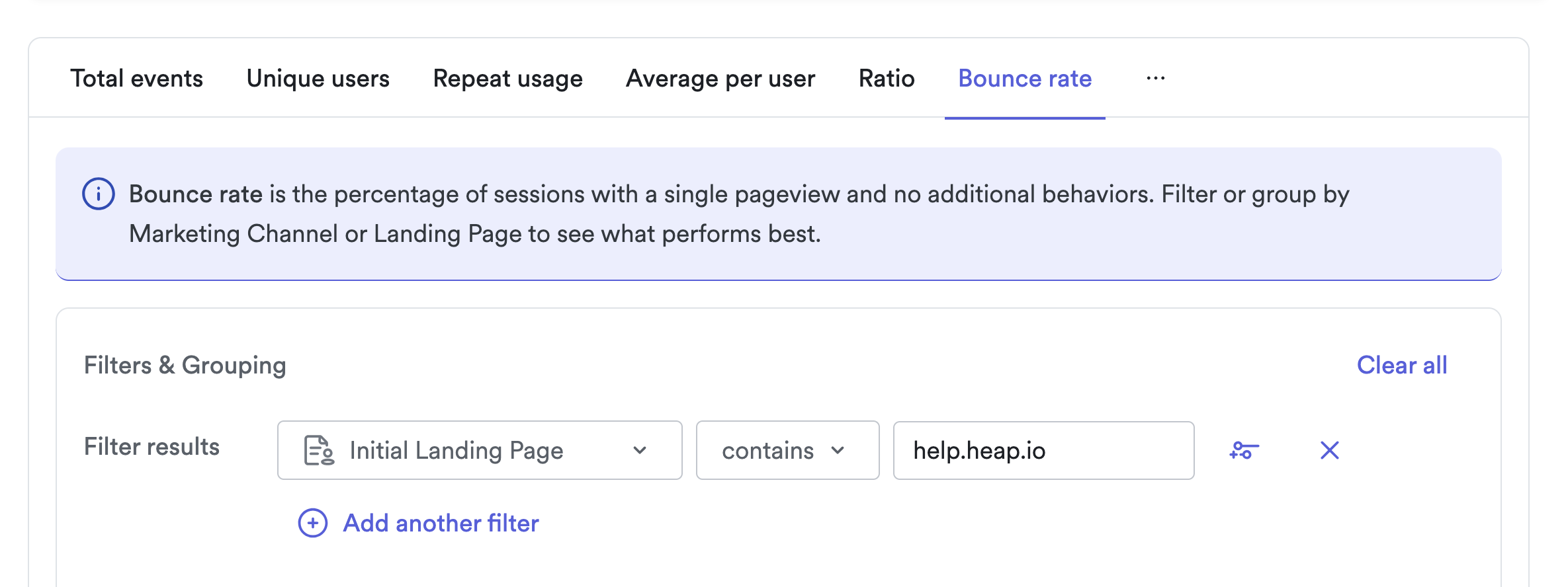 Bounce rate is available in the Acquisition and Usage over time chart types. To learn more, see Acquisition analysis overview and Usage over time overview.
