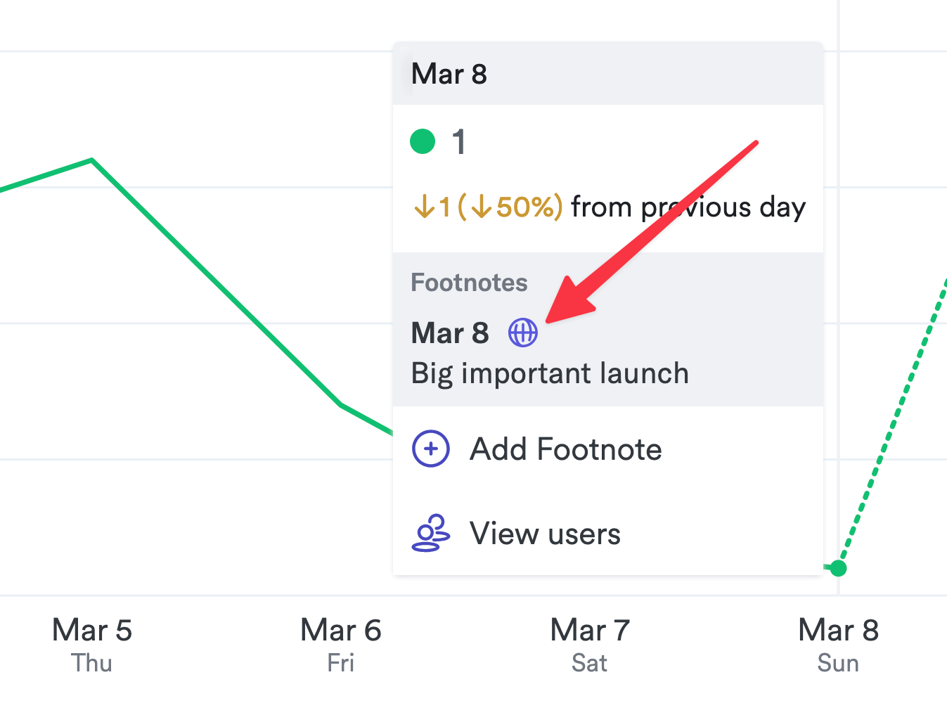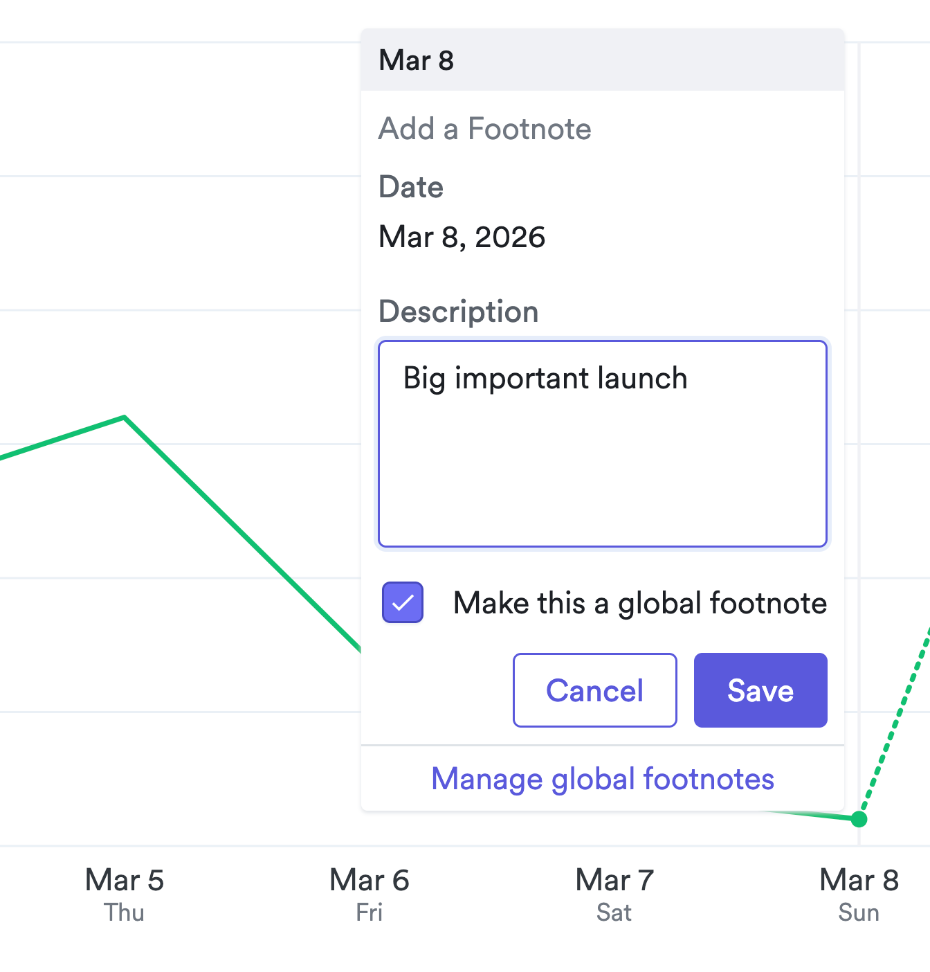 Hover over the date where you want your new footnote and click Add footnote. Add a description, and make sure to select Make this a global footnote before you click Save.